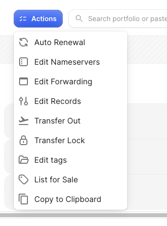 To update your DNS records in bulk, go to your Domains page and filter by 'DNS' domains. Tick the Domains you wish to update and select 'Actions':