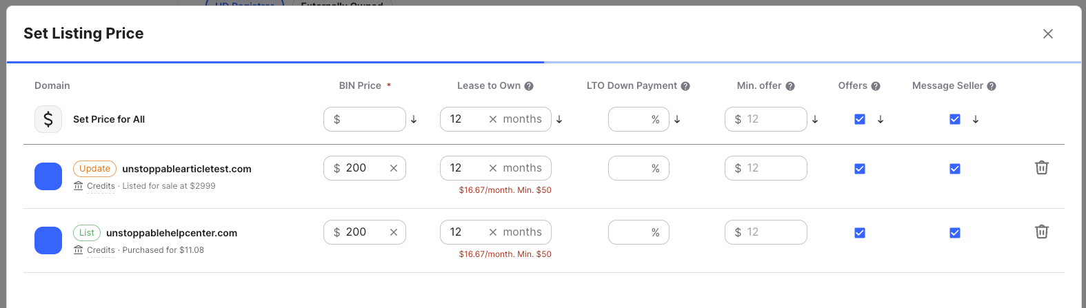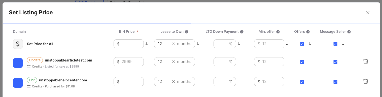 It will then take you to the pop-up where you can make any changes to the price, enable or disable Lease to Own including a downpayment percentage, set a minimum offer or turn off make offer entirely, and enable or disable the message seller option. All of these can be done for all domains.