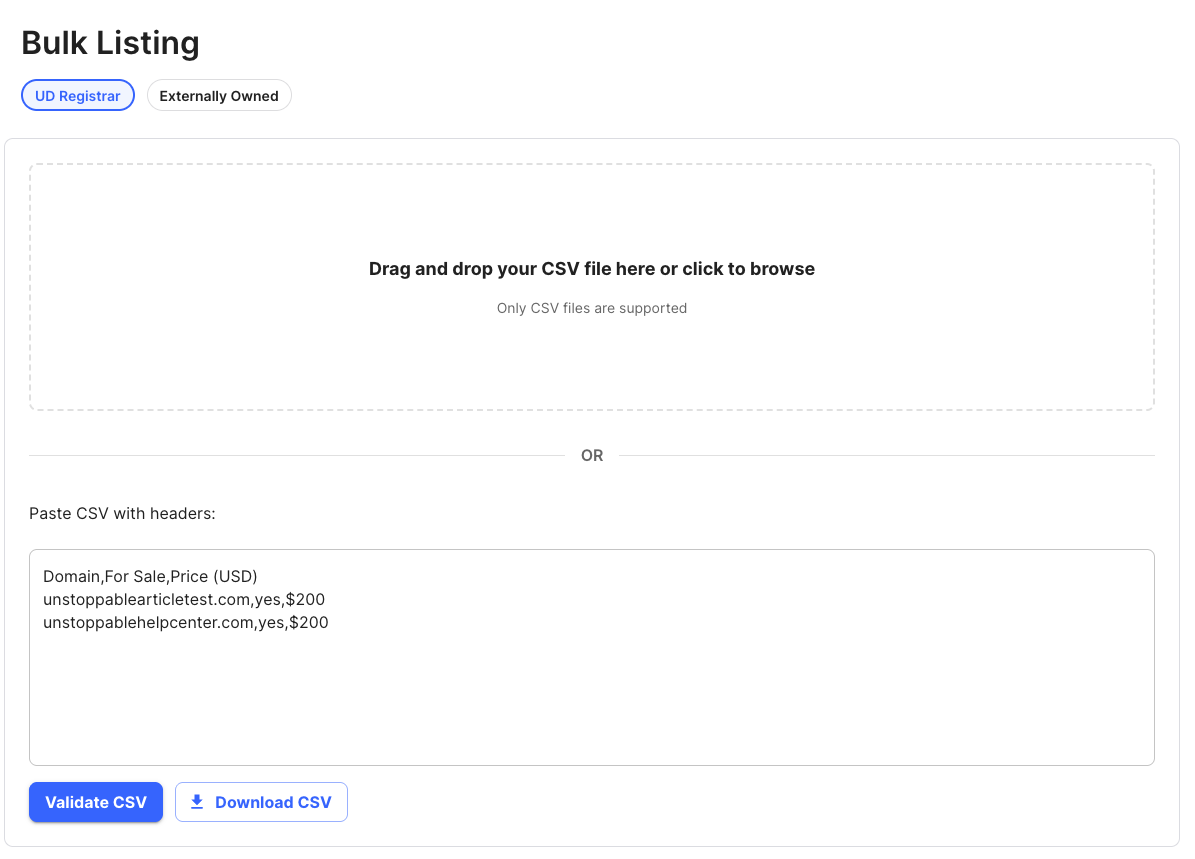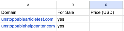 In the CSV you can list the domain names, note it is for sale or not, and set the price in USD.