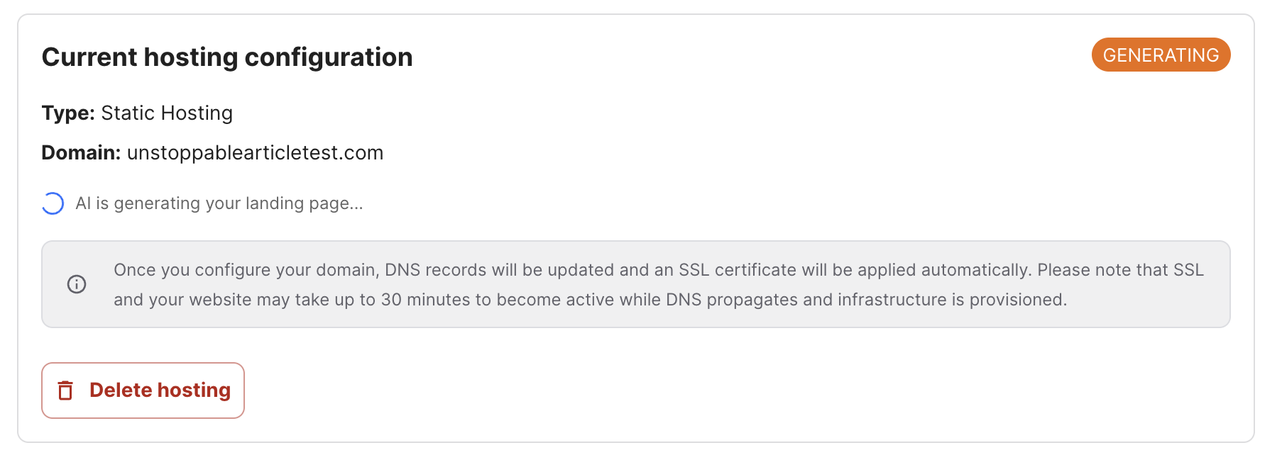 Once your hosting is configured, DNS records will be updated and an SSL certificate will be provisioned automatically. Please allow up to 30 minutes for your site and SSL to become fully active while DNS propagates and infrastructure is set up.
