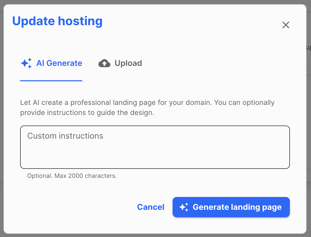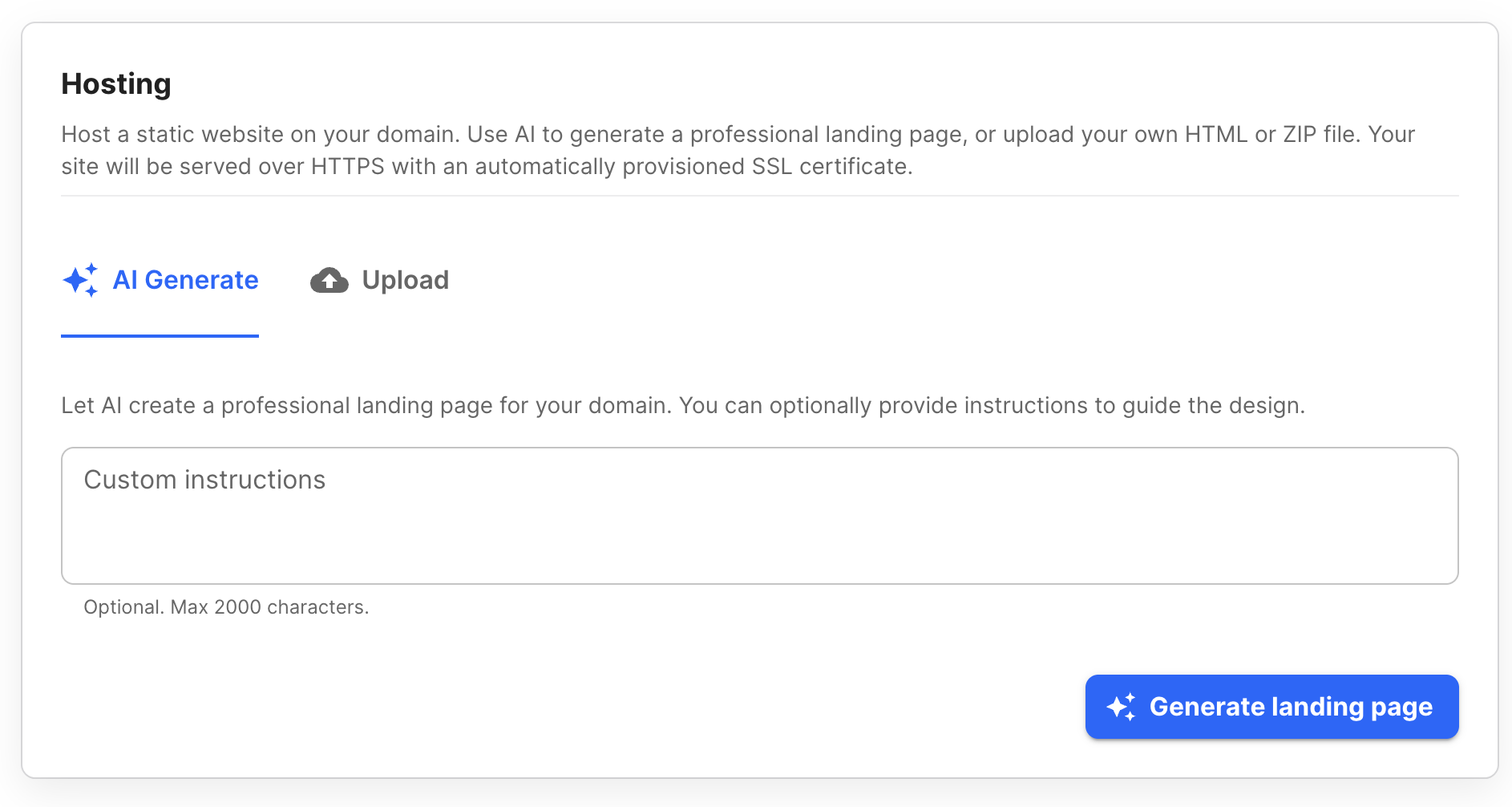 You can use AI to generate a professional landing page, or upload your own HTML or ZIP file. Your site will be served over HTTPS with an automatically provisioned SSL certificate.